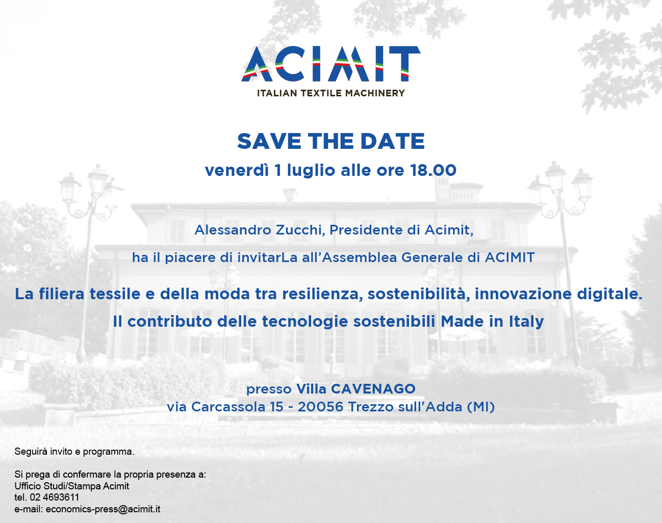 | Assemblea Generale ACIMIT – parte pubblica (Milano, 1 luglio 2022) – SAVE THE DATE Venerdì 1 luglio p.v., alle ore 18.00 presso VILLA CAVENAGO (Via Carcassola, 15 – 20056 Trezzo D’Adda MI), si terrà l’Assemblea pubblica di ACIMIT che avrà come tema “La filiera tessile e della moda tra resilienza, sostenibilità, innovazione digitale. Il contributo delle tecnologie sostenibili Made in Italy”. Il Save the Date è disponibile qui. L’evento è completamente gratuito, il programma definitivo e il modulo di registrazione verrà trasmesso a breve. |