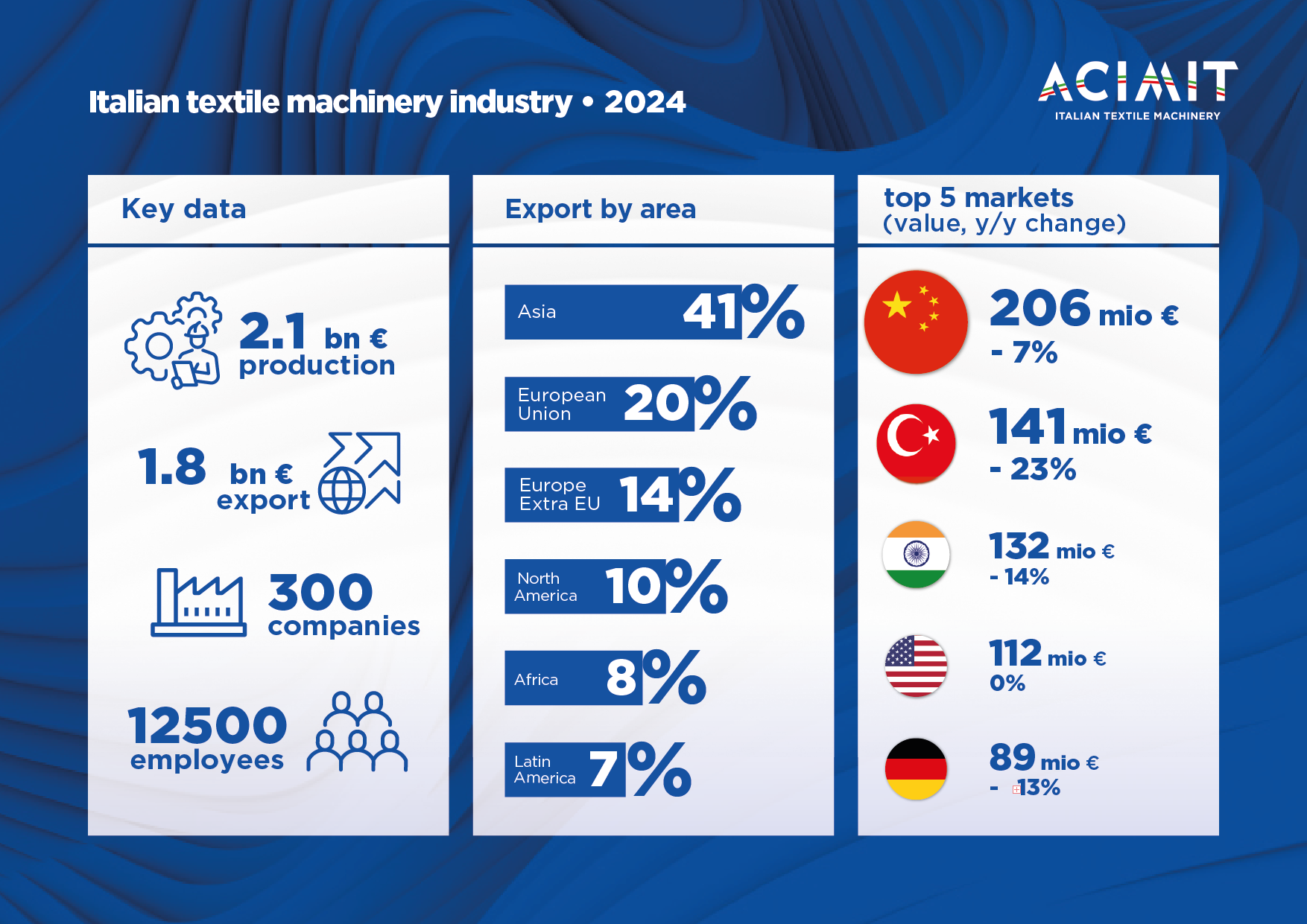 ACIMIT (the Association of Italian Textile Machinery Manufacturers) is a private non-profit making body and its main purpose consists in promoting the Italian textile machinery sector and in supporting its activity, mainly abroad, through the most updated and innovative promotional means, constantly improved over the almost 80 years of its life.
