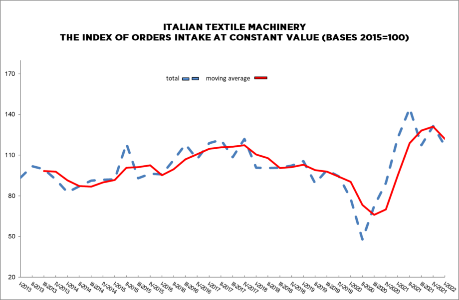 The orders index for textile machinery for the first quarter of 2022, processed by ACIMIT, the Association of Italian Textile Machinery Manufacturers, shows a slight decrease (-4%) compared to the same period from January to March 2021. In absolute value, the index stood at 117 points (basis: 2015 = 100).