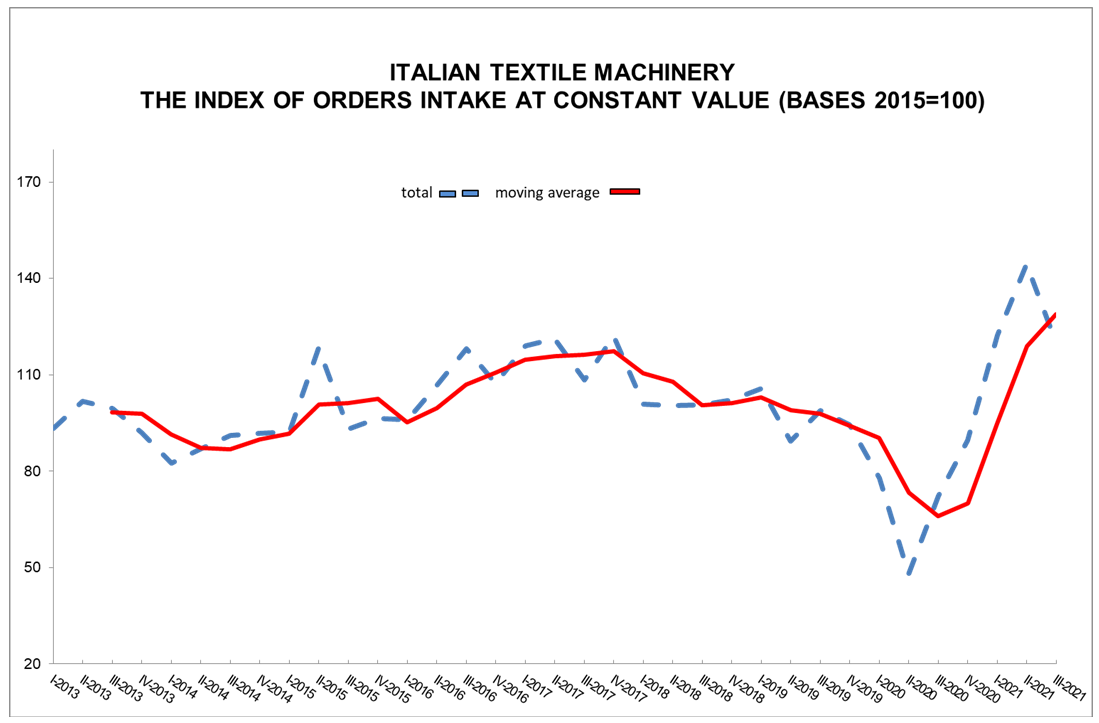 The index of orders intake for Italian textile machines, as compiled by ACIMIT, the association that groups together Italian textile machinery producers, rose by 66% for the period from July to September 2021 compared to the same period in 2020. The value of the index stood at 119.8 points (basis 2015=100). This growth has concerned both the Italian and foreign markets, with an increase in domestic orders of 130% compared to the same period in 2020, and up 54% for foreign orders.