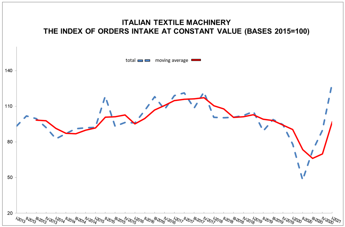 The index of orders intake for textile machinery compiled by ACIMIT, the Association of Italian Textile Machinery Manufacturers during the period January-March 2021 was up by 66% compared to the same period for 2020. The value of the index was confirmed at 129.3 points (basis: 2015 = 100).