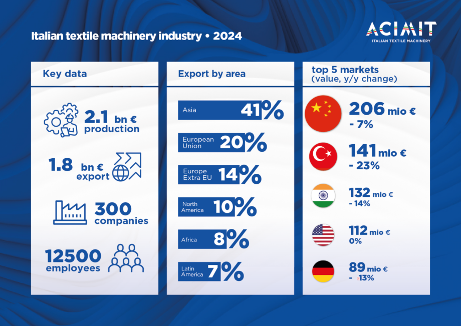 Italy is today one of main producers and exporters of textile machinery in the world. In 2024, the production of Italian textile machinery amounted to 2.1 billion of Euro, 86% of which (worth 1.8 billion Euro) exported in about 130 Countries. Asia (41%) is the main export area, followed by European Union (20%), Europe extra EU (14%), North America (10%), Africa (8%) and South America (7%).