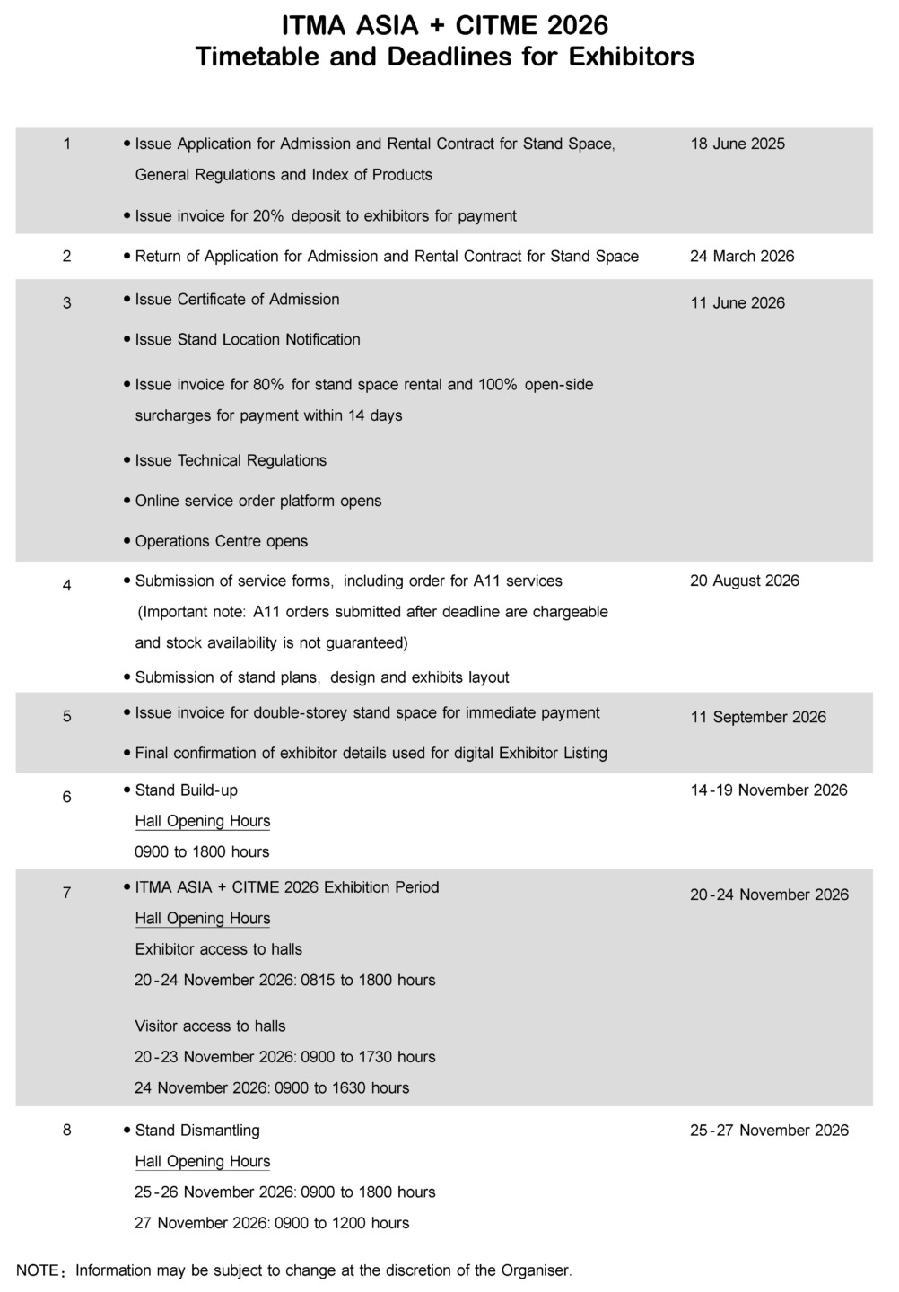 Home / I nostri servizi / Marketing e Promotion / ITMA / ITMA ASIA + CITME 2026 Shanghai / Timetable & Deadlines