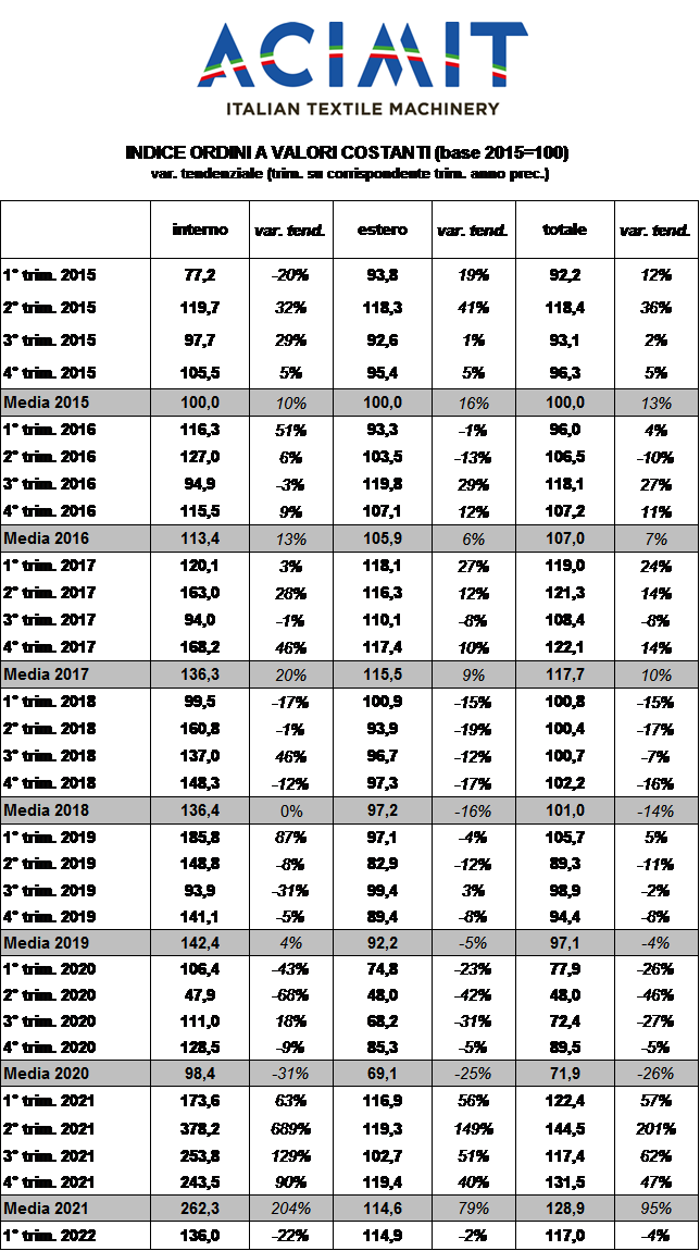 MACCHINE TESSILI: INDICE ORDINI IN CALO NEL PRIMO TRIMESTRE 2022